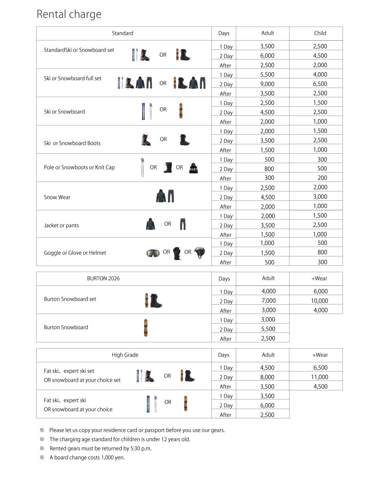 Rental ChargeGear size区分BoardBoard bootsSkiSki bootsWearAdult135cm ~ 165cm22.5cm ~ 33cm135cm ~ 178cm22.5cm ~ 31cmXS ~ 4LChild70cm ~ 130cm18.5cm ~ 25cm70cm ~ 150cm 16.5cm ~ 25cm84cm ~ 150cm